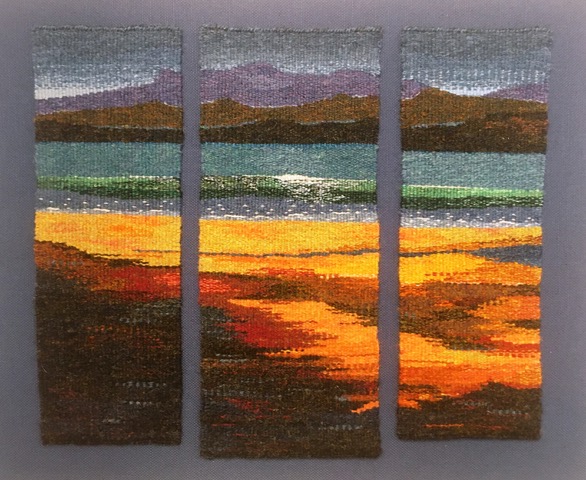 As I looked around the gallery wondering where to start my attention was drawn to a seascape ‘The wave at Dalmore Bay, Isle of Lewis’ woven by Elizabeth Radcliffe who had noted under its title “As I got weaving, I remember thinking I’m never doing this again!”. Looking closely at how she had expressed the sense of movement and agitation of the water I appreciated her sentiment and skill in the detail that she portrayed. For me it was the highlight of the exhibition.